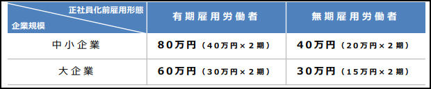 このように定められた正規雇用労働者に転換した場合、有期契約労働者から正規に転換すれば1人当たり80万円、無期契約労働者からの転換であれば40万円の助成金が支給されます。