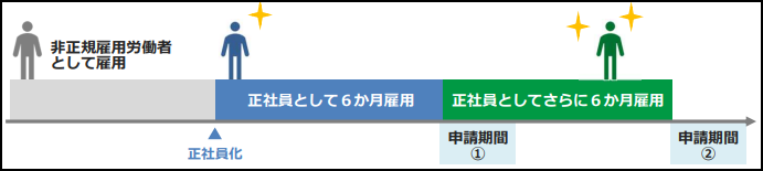 正社員転換後6か月が経過し賃金を全額支給されたら、初回の助成金申請ができます。さらにその後6か月が経過すれば、2回目の申請によりすべての助成金の受給が完了します。